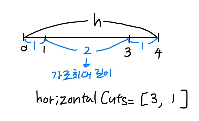 가로가 최대인 것을 찾으려면 0, horizontalCuts, h 사이의 간격들 중에 가장 긴 부분을 길이를 찾아서 저장한다.